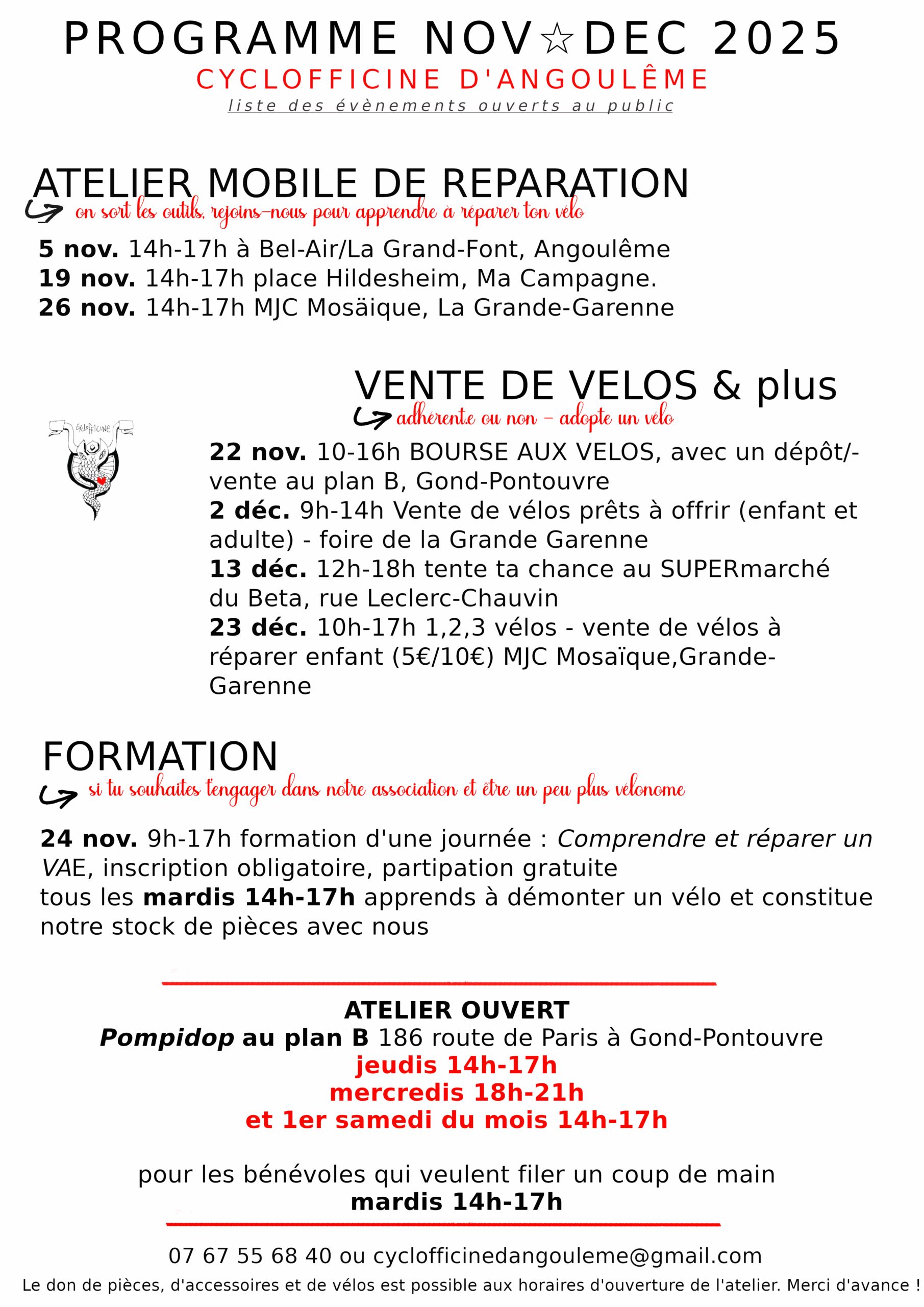 - Vous voulez donner un coup de main pendant nos permanences ? Pour accueillir, tenir la caisse, présenter le fonctionnement ou filer un tuyau en mécanique ? Inscrivez-vous sur le tableau des permanences : https://lite.framacalc.org/9hqh-benevolescycloangouleme. Il faut au moins deux personnes pour ouvrir l’atelier. A défaut, nous serons obligés d’annuler les permanences. Si vous n’avez pas (encore) d’expérience dans la tenue des ateliers, vous pouvez préciser que vous souhaitez être accompagné.